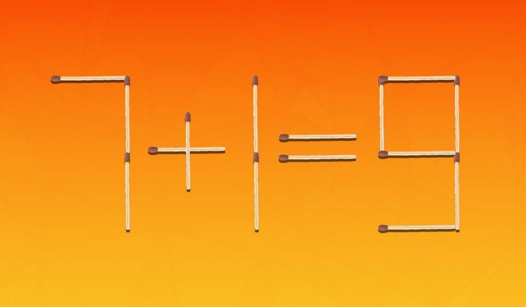 Aşağıda 7+1=9 eşitliğinin eşleşmelerle düzenlendiği bir resim göreceksiniz. Açıkçası matematiksel olarak yanlıştır ve 15 maçtan yalnızca ikisini hareket ettirerek düzeltmeniz gerekir.