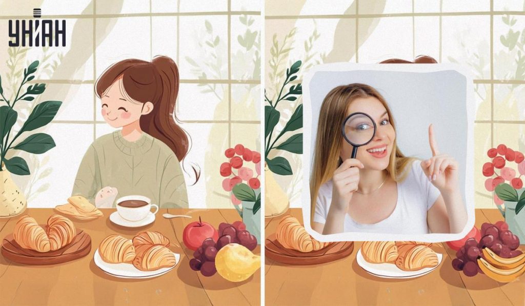 Resimler, mutfağında kahvaltı yapan sevimli bir kızı gösteriyor. Lezzetli kruvasanlarla kahve (veya çay) içer. Tatlı olarak da meyve bekliyor. Görüntüler neredeyse aynı görünüyor, aralarında dört ince fark var. Onları bulabilir misin?
