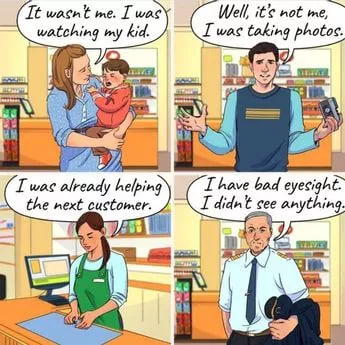 Tek yapmanız gereken aşağıdaki resme bakmak ve mağazadaki hangi kişinin birinin cüzdanını çaldığını belirlemek. Resimdeki kişilerden üçü doğruyu söylüyor ama biri yalan söylüyor.
