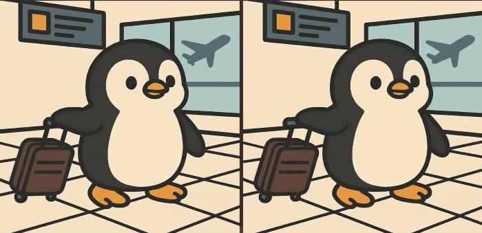 Peki bir sonraki mücadeleye hazır mısın? Havaalanında bagaj taşıyan sevimli penguenin iki resmine yakından bakın. İlk bakışta aynı görünebilirler ancak 3 küçük farkı gizlerler. Hepsini 61 saniyede bulabileceğinizi mi düşünüyorsunuz? Deneyin ve görme keskinliğinizi test edin!