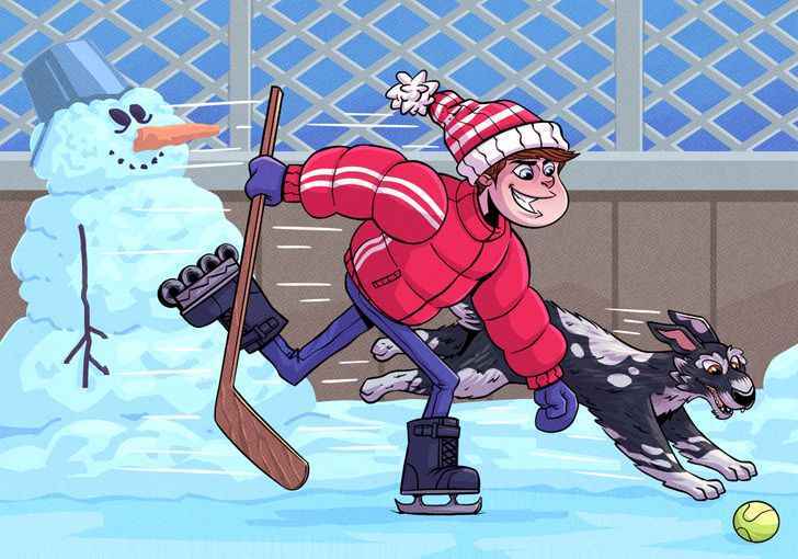 Resimde buzda kayan bir çocuk ve çocuğun yanında koşan bir köpek görüyoruz. İlk bakışta çizimde hiçbir hata yokmuş gibi görünebilir ancak gerçekte durum böyle değildir. Yakından bakıldığında bazı şeylerin yanlış tasvir edildiği anlaşılıyor.